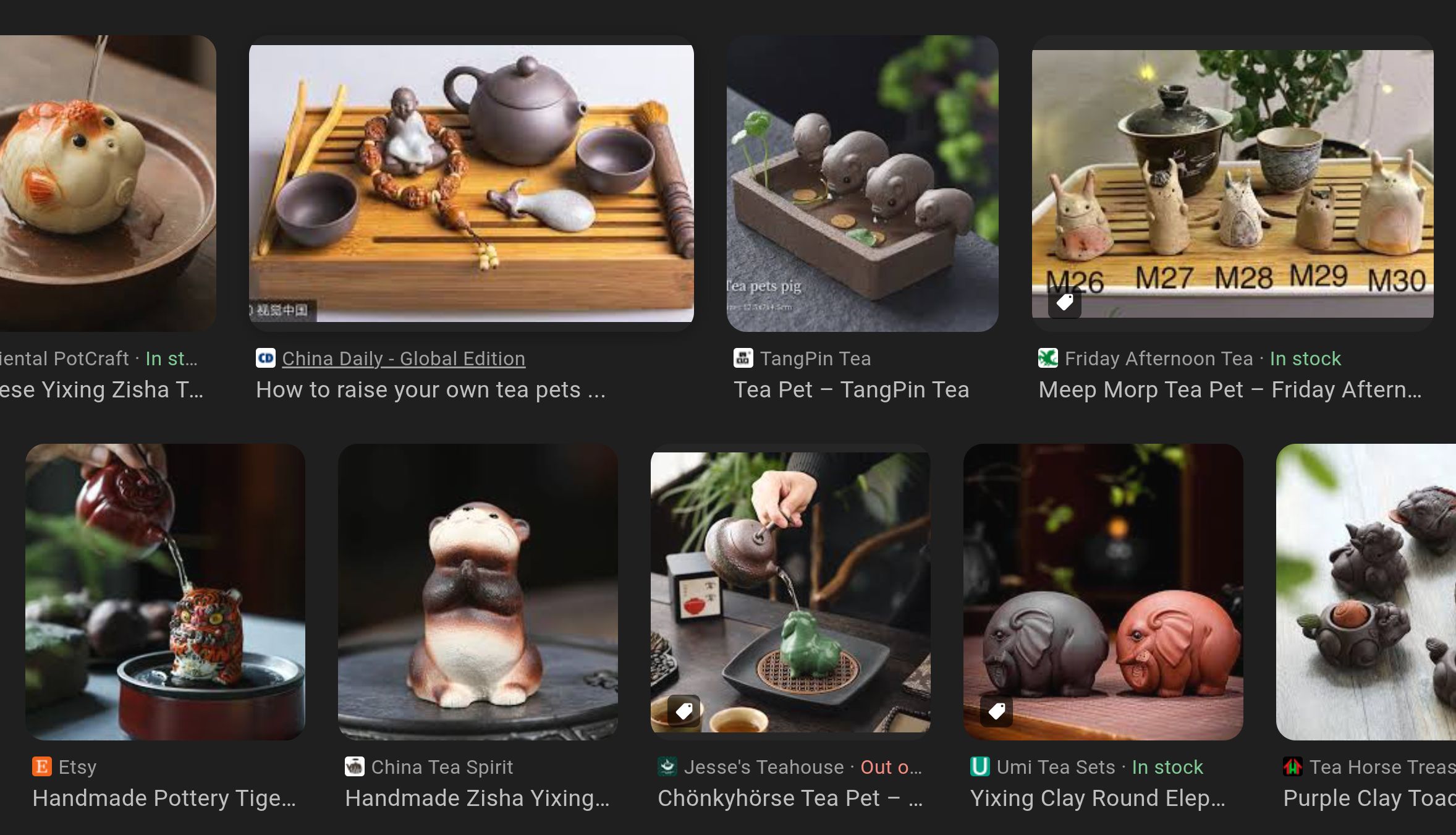 Part of this tradition of tea making are tea pets. These are ceramic animals or other figurines that you bring out with your tea set. The first steep you do is poured on your little guy, and you don’t drink it.